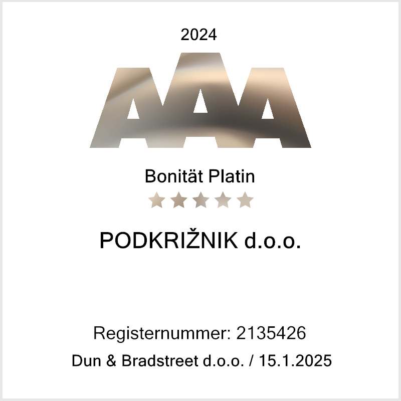 Mit dieser Anerkennung bestätigen wir unsere hervorragende Geschäftstätigkeit als eines der zuverlässigsten Unternehmen in Slowenien.
